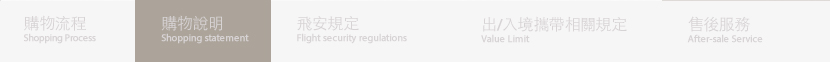各位旅客有責任確保所購買之免稅商品符合目的地國家的免稅限額及安全規定,於其他地區過境之旅客皆須事先洽詢當地相關海關安檢規定。